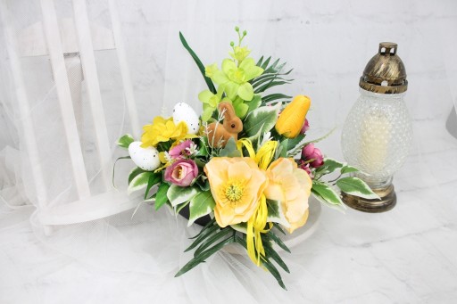 Całość jest utrzymana w wielkanocnej tonacji z dodatkiem zieleni dekoracyjnych liści i traw idealnie wpisujących się w obecne trendy sezonu.