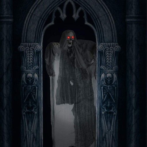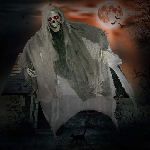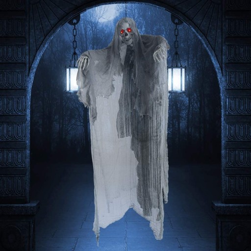 Horror wiszący ponury żniwiarz z przerażającym krzykiem i oświetlonymi oczami LED Straszne krzyki i migające oczy LED aktywowane przez wszelkie dźwięki, takie jak chodzenie, mówienie lub krzyki dzieci. Aktywacja dźwiękiem jest czuła i łatwa do uruchomienia 170 cm ogromny rozmiar życia wysoki! Wymagane baterie AA (brak w zestawie) Świetnie nadaje się na imprezę tematyczną Halloween, dekoracje wewnętrzne i zewnętrzne lub dekoracje nawiedzonego domu! Powieś na drzewie, oknie lub ścieżce, przez którą przejdzie odwiedzający (pamiętaj, że ten produkt nie jest wodoodporny, nie pozostawiaj go w deszczu)