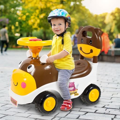 Jeździk krówka z uśmiechniętą buźką o słodkim wyglądzie zapewniający ogromną frajdę dla dziecka. Wyposażony jest w schowek pod siedzeniem, klakson w kierownicy oraz wygodne siedzenie z wyjmowanym oparciem.