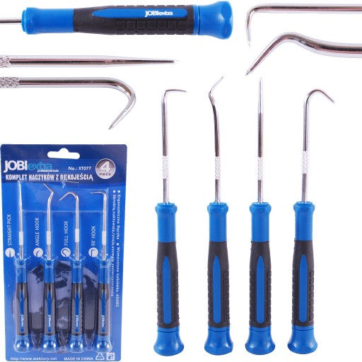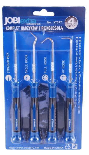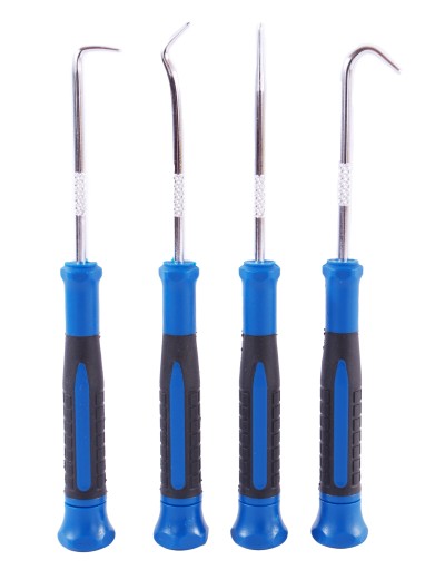 Zestaw 4-elementowy długich haków. Idealny do usuwania uszczelek olejowych, o-ringów, zawleczek, itp. Rękojeść narzędzi wykonana została z wysokiej jakości antypoślizgowego tworzywa sztucznego zapewniającego pewny chwyt i komfort podczas pracy.