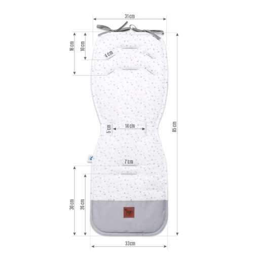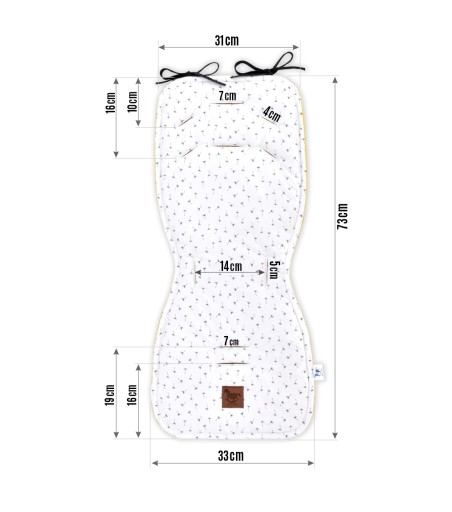 Uniwersalna wkładka do wózka spacerowego. Wygodna i miękka podkładka zapobiega zsuwaniu się dziecka z siedziska. Uszyta została dla wymagających mam i ich maluszków. Dzięki niej zdecydowanie łatwiej chronić siedzisko wózka przed zabrudzeniem i okruszkami. To elegancki i stylowy dodatek do wózka.
