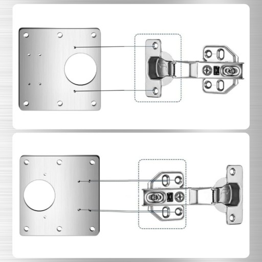 - Przykręć zawias do płytki naprawczej w dwa naprzeciwległe otwory. W zależności od typu zawiasu i odległości w szafce od krawędzi wybierz jedną parę otworów.