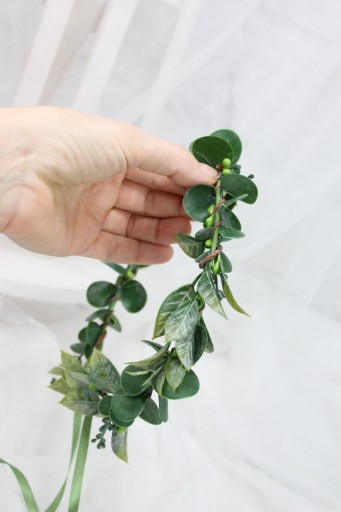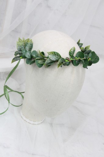 Delikatny i subtelny wianek komunijny upleciony z liści eukaliptusa z dodatkiem perełek.