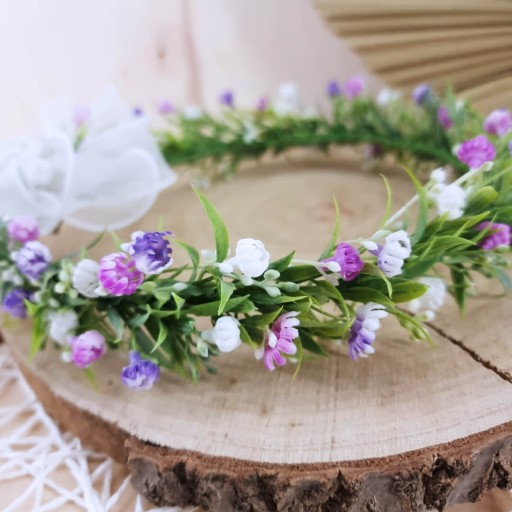 Przepiękny wianek komunijny zielonymi i fioletowymi wstawkami ręcznie robiony