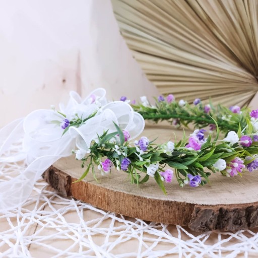 Śliczny wianek komunijny dla dziewczynki na uroczystość Sakramentu I Komunii Świętej wykonany z białych i fioletowych kwiatuszków, na zielonej podstawie emitującej trawę. Ręcznie robiony. Połączenie biało fioletowych kwiatuszków z zieloną tzw. trawą daje efekt naturalizmu. Na żywo jeszcze piękniejszy. Klasycznie zdobiony, pełny, doskonałej jakości. Z tyłu wianka kokarda wykonana z tiulu z lokami nadaje wiankowi elegancji. Całość wygląda przepięknie.