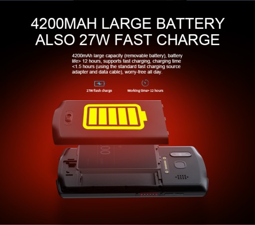 - Nowy system Android 10.0 oparty na wydajnej konfiguracji sprzętowej: 8-rdzeniowy Cortex-A76 2.0 GHz ze wsparciem telefoni 5G oraz 4 GB RAM i 64 GB ROM gwarantują płynną pracę z nowymi aplikacjami. Stopień ochrony IP66 oraz wzmocniona konstrukcja z zabezpieczonymi uszczelkami portami oraz pojemny akumulator 4200mAH 4.3V Li-polymer gwarantują długą, bezawaryjną pracę w warunkach przemysłowych.