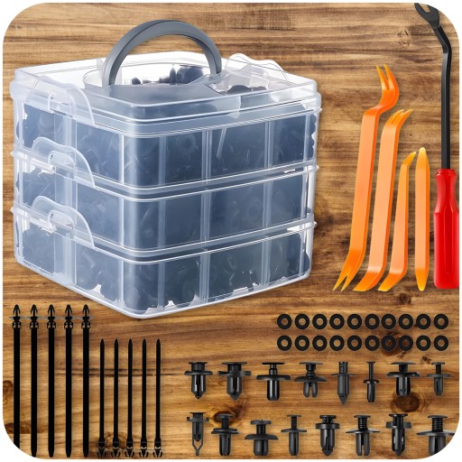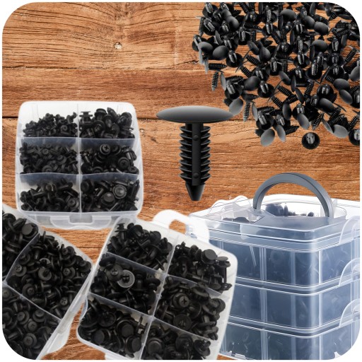 ✅ Zestaw 625 ELEMENTÓW, w skład którego wchodzi 18 najpopularniejszych rozmiarów klipsów i łączników mocujących. Zestaw został wzbogacony o narzędzie do usuwania klipsów.