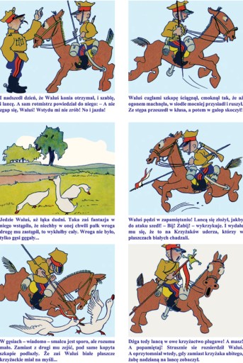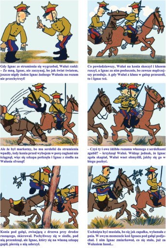 W sumie w książce występuje około 468 scenek i 468 ramek z pełnym humoru, opisującym każdą scenkę, tekstem.W pamięci pozostają barwne postacie komiksu: Waluś i Ignac oraz inni.Przedstawione są zabawne przygody, Walusia , Ignaca i ich kolegów jako Ułanów Krechowieckich.
