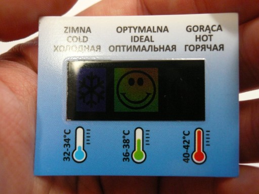 Termometr należy nakleić z boku wanienki, jak najbliżej jej dna. Po tym, jak woda osiągnie temperaturę w danym zakresie - okienko w termometrze zaświeci się.