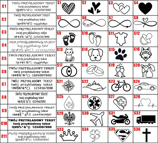Wybierz który wzór mamy wygrawerować na Twojej biżuterii (możesz wybrać spośród naszych propozycji lub podać swoją indywidualną treść grawera)