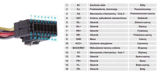 Złącze przejściówka kabel z gniazdem TOYOTA (np. Corolla, Avensis T25, T27, Yaris, Prius, RAV-4 itd) do radia Android 2DIN - do większości chińskich stacji z Android z obsługą sterowania z kierownicy (K1 i K2) i kamery cofania (BACK/REVERSE)