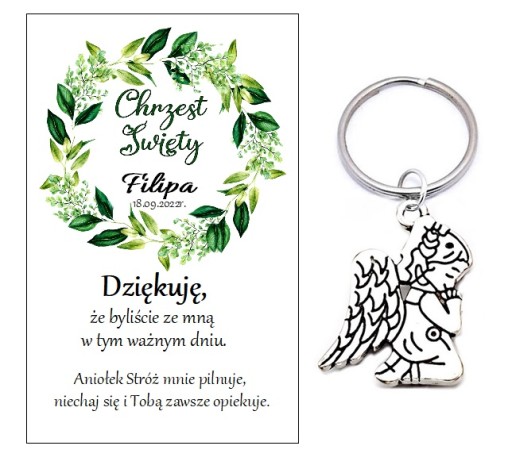 PAMIĄTKA PREZENT PODARUNEK DLA GOŚCI Z OKAZJI CHRZTU - KARTECZKA Z PODZIĘKOWANIEM I BRELOCZKIEM W KSZTAŁCIE ANIOŁKA.