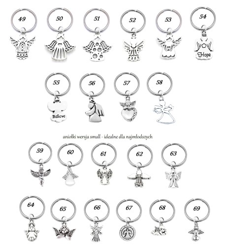 Wielkość aniołków ok. 20-25mm, wielkość kółeczka breloka 20mm, papier ozdobny o gramaturze 260g, wymiary karteczki ok. 6x9cm