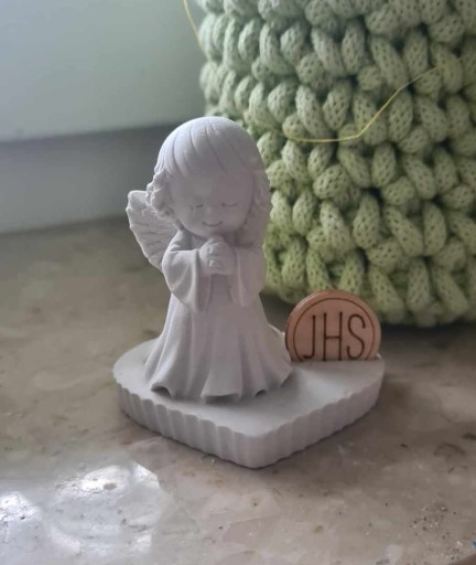 Aniołki, wykonane ręcznie z gipsu ceramicznego zapakowane w elegancki foliowy woreczek zawinięty wstążką wraz z dołączonym bilecikiem.