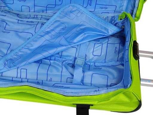Średnia torba podróżna na dwóch kołach włoskiej marki Dielle. Wykonana z bardzo wytrzymałego poliestru wzmacnianego. Posiada teleskopowo wysuwany stelaż, dwa stabilne koła, wzmacniane dno. Wygodne uchwyty z boku i u góry ułatwiają umieszczenie jej w bagażniku auta lub zdjęcie z lotniskowego transportera. Dwie kieszenie zewnętrzne na podręczne drobiazgi. System regulowanych bocznych pasów pozwala na dopasowanie kształtu torby w zależności od ilości rzeczy które aktualnie zostały spakowane, tak aby bezpiecznie je transportować. Komora główna torby zabezpieczona jest zamkiem szyfrowym w standardzie TSA. Wnętrze wyłożone podszewką podzielone jest na ergonomicznie zaprojektowane kieszenie. W jednej z nich znajdują się regulowane pasy.