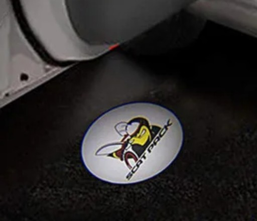 Przedmiotem sprzedaży jest komplet 2 szt nowych Projektorów lampek LED w drzwi do Dodge Charger Scatpack Scat Pack emitujących logo Scatpack Scat Pack na białym tle.