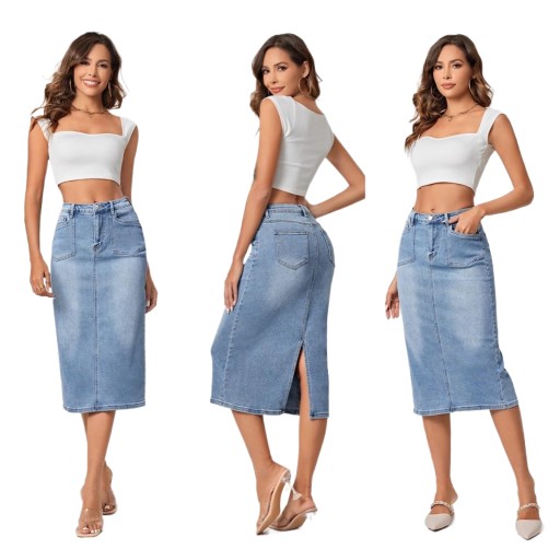 Klasyczna długa spódnica jeansowa z rozcieciem z tyłu. Wykonana z elastycznego materiału, bardzo ładnie dopasowuje się do ciała. Długa spódnica jeansowa to klasyczny element garderoby, który wprowadza do stylizacji nutę casualowego uroku i wygody. Ta spódnica jest zarówno modne, jak i praktyczne rozwiązanie na wiele okazji.
