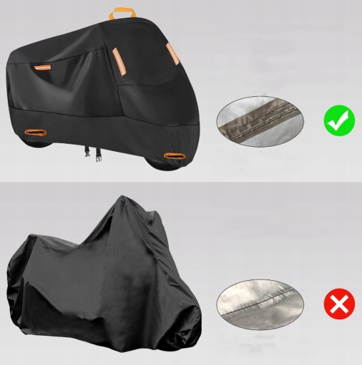 Podwójnie przeszyte i wodoodporne paski: podwójnie szyte szwy sprawiają, że pokrowiec na motocykl jest bardziej wytrzymały. Wodoszczelne paski sprawiają, że pokrowiec motocyklowy jest bardziej wodoszczelny, nie przemaka wody.