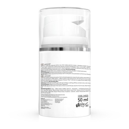 Delikatna maska dla zmęczonej okolicy oczu, która nadaje spojrzeniu świeży i rozbudzony wygląd. Pozostawia skórę rozświetloną, a zmarszczki i „kurze łapki” zredukowane. Zawiera kwas kawowy, naturalnie występującą w oleju z nasion kawy - kofeinę, olej jojoba i koenzym Q10. Pobudzając mikrokrążenie sprawia, że cienie pod oczami stają się jaśniejsze, a opuchlizna całkowicie znika. Naturalny “wypełniacz” w formie ekstraktu z maku głęboko nawilża i napręża skórę pod oczami uzyskując efekt skin-plumpingu.