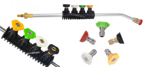 - Ponadto lanca ma zamontowany gumowy uchwyt do wygodnego przechowywania dostarczonych dysz.