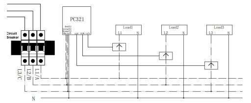 Urządzenie może działać w instalacji 3-fazowej i mierzyć zużycie dla każdej fazy lub w jedno fazowej i mierzyć zużycie energii dla 3 osobnych obwodów.