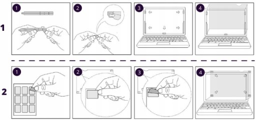 Dzięki zaczepom przyklejanym na ramę monitora w łatwy i szybki sposób w dowolnym momencie możemy założyć i zdjąć filtr. Metoda ta sprawdzi się w przypadku, kiedy chcemy podzielić się zawartością wyświetlaną na ekranie. Bardziej dyskretnym, niewidocznym sposobem są przeźroczyste paski naklejane bezpośrednio na ekran.