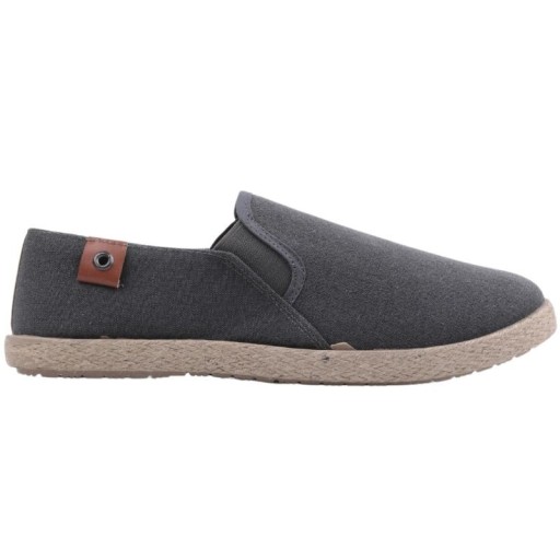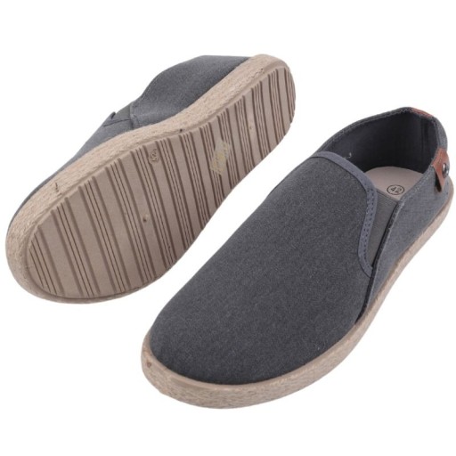 Espadryle męskie wsuwane, z cholewką odsłaniającą kostkę. Ozdobione przeszyciami. Po bokach znajdują się niewielkie wstawki ze ściągacza, które ułatwiają zakładanie. Osadzone na płaskiej podeszwie. Wykonane z materiału. Wkładka jest z ekoskóry.