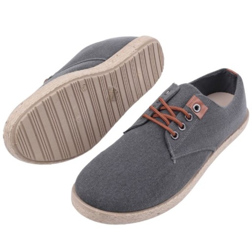 Espadryle męskie wykonane z materiału tekstylnego. Osadzone na płaskiej, wygodnej podeszwie oplecionej jutowym sznurkiem. Ciekawie zaprojektowana cholewka. Wiązane na sznurowadła. Klasyczny okrągły nosek, z jutową wstawką. Ekoskórzana wkładka zadba o wygodę podczas długich spacerów.