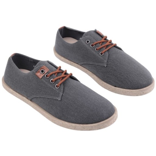 Espadryle męskie wykonane z materiału tekstylnego. Osadzone na płaskiej, wygodnej podeszwie oplecionej jutowym sznurkiem. Ciekawie zaprojektowana cholewka. Wiązane na sznurowadła. Klasyczny okrągły nosek, z jutową wstawką. Ekoskórzana wkładka zadba o wygodę podczas długich spacerów.