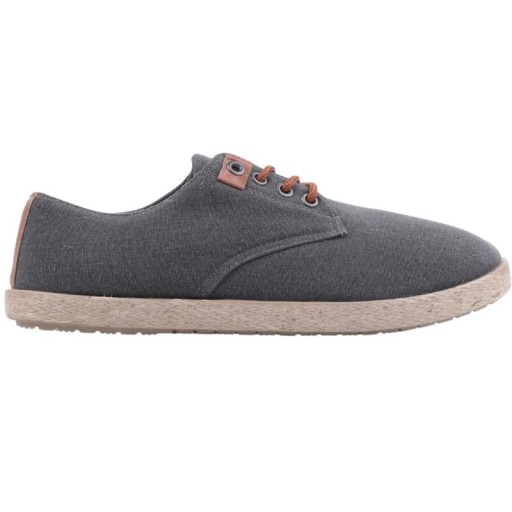 Espadryle męskie wykonane z materiału tekstylnego. Osadzone na płaskiej, wygodnej podeszwie oplecionej jutowym sznurkiem. Ciekawie zaprojektowana cholewka. Wiązane na sznurowadła. Klasyczny okrągły nosek, z jutową wstawką. Ekoskórzana wkładka zadba o wygodę podczas długich spacerów.