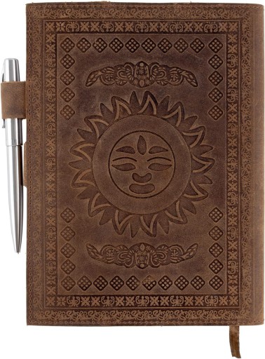 - ★ PODCZAS GDY WIELE NOTATNIKÓW I DZIENNIKÓW JEST POKRYTYCH NISKIEJ JAKOŚCI SZTUCZNĄ SKÓRĄ, która łatwo się rysuje, nasze skórzane notatniki są oprawione w RĘCZNIE WYCINANĄ, 100% PEŁNOZIARNISTĄ SKÓRĘ BAWOLĄ, która nadaje im piękny, autentyczny wygląd w stylu vintage. Dzięki wstawce z półszlachetnego niebieskiego kamienia i wytłoczonemu wzorowi słońca, ten skórzany notes o wymiarach 22x16 cm świetnie sprawdzi się jako dziennik do medytacji, dzięki któremu poczujesz INSPIRACJĘ!