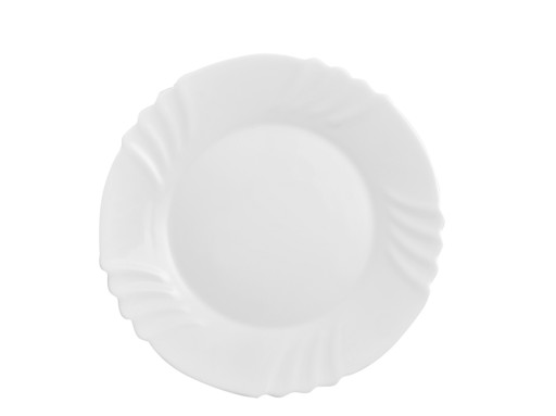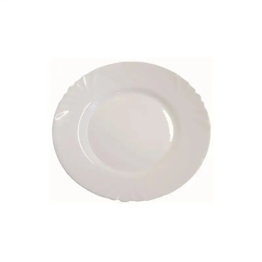 Biały talerzyk deserowy, z delikatnym zdobieniem na brzegach. Lekki i mocny, łatwy w czyszczeniu. Talerz do domu i gastronomii.
