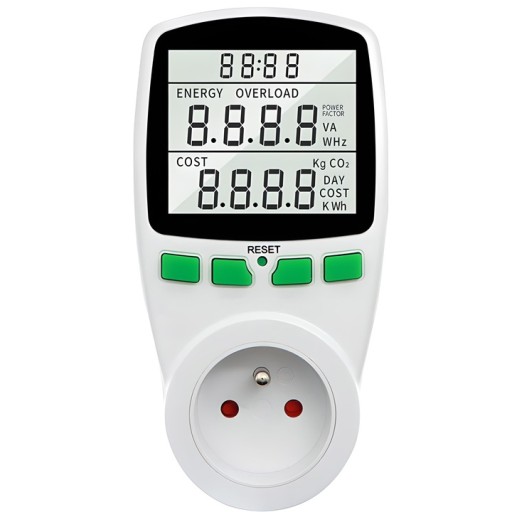 Licznik poboru mocy z wyświetlaczem i alarmem przeciążeniowym. Przed pierwszym użyciem watomierza należ go zresetować. W tym celu należy przytrzymać przez ok 10 sekund zielony przycisk RESET znajdujący się na obudowie tuż pod wyświetlaczem.