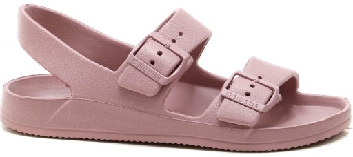 Sandały damskie wykonane z lekkiego, piankowego tworzywa. Model ten posiada regulowane paski zapinane na sprzączki. Świetny model na upalne dni! Osadzone na delikatnej platformie. Sandałki te posiadają z tyłu paseczek podtrzymujący stopę.