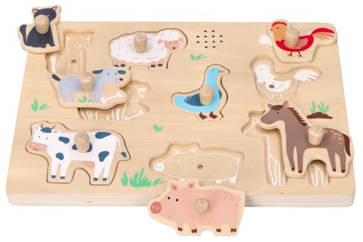 Dźwiękowa propozycja od marki Adam Toys. Maluch poznaje zwierzaki z zagrody, jednocześnie dopasowując ich kształt do odpowiedniego miejsca na układance. Jeśli prawidłowo umieści zwierzątka na swoim miejscu, usłyszy realistyczny odgłos jaki wydaje dopasowywany zwierzak. Pies szczeka, kot miauczy, konik rży itd. Układanka wykonana jest z naturalnego drewna, złożona z podstawy i 8 zwierzątek z farmy. Znajdziecie tu: psa, kota, konika, świnkę, krowę, owcę oraz kaczkę i kurę.