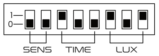 Dostosowanie pracy urządzenia w zależności od natężenia oświetlenia dla wybranej wartości lux – 5/30/150/2000. Czujnik może reagować w dzień, kiedy jest ustawiony w pozycji maksymalnej 2000. Po ustawieniu na wartość minimalną urządzenie będzie aktywowane tylko w ciemności. Przy ustawieniu wartości maksymalnej - 2000 LUX, czujnik będzie aktywować podłączone urządzenie zarówno w dzień jak i w nocy.