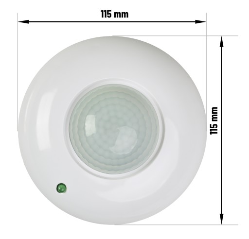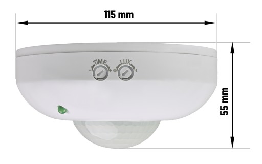 Czujnik PIR przeznaczony do montażu sufitowego - natynkowego. Dzięki estetycznie wykonanej obudowie, doskonale komponuje się z sufitem. Urządzenie wyposażone jest w czujnik PIR, fotodiodę oraz regulację, która umożliwia zautomatyzowane sterowanie urządzeniem, uwzględniając parametry, takie jak: natężenie światła, oraz czas czuwania.