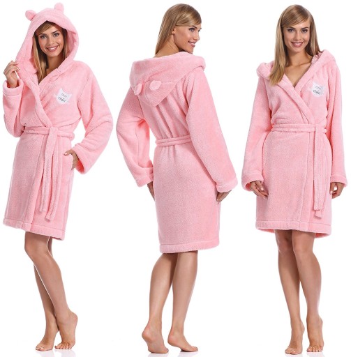 Krótki szlafrok w stonowanych kolorach - kaptur z uroczymi uszami. Na wysokości piersi haftowana aplikacja.
