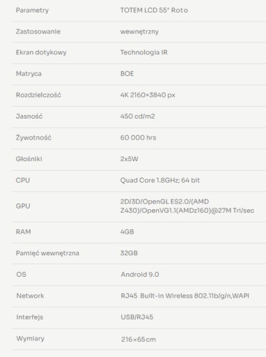 TOTEM LCD 55" Rotacyjny– Nowoczesny ekran dotykowy LCD to innowacyjny sposób prezentacji treści reklamowych. Według niezależnych badań reklama z ekranami LCD jest kilkaset razy skuteczniejsza niż na zwykłych totemach.