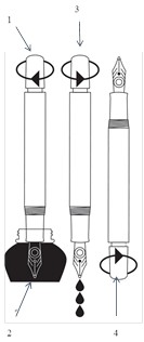 - Zanurz całą długość stalówki w atramencie i powoli napełniaj pióro aż do momentu kiedy tłoczek nie będzie się dał obracać