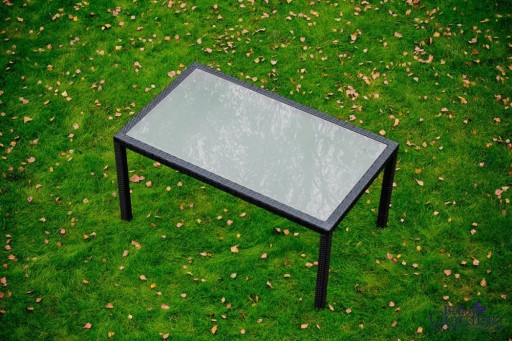 Szklany, matowy blat stołu jest wbudowany w technorattanową ramę.