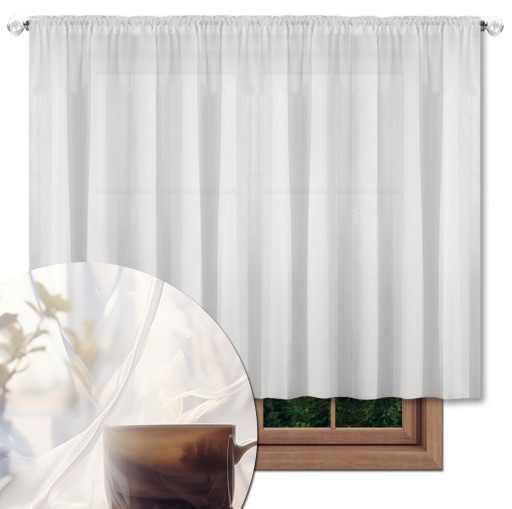 Krótka firana dekoracyjna, wykonana została z najwyższej dostępnej na rynku jakości gładkiej tkaniny, jaką jest woal. Góra firany została zaopatrzona w taśmę marszczącą z tunelem, dzięki czemu zawieszenie firany jest możliwe na karniszu rurkowym. Użycie taśmy spowodowało, że możemy efektownie zmarszczyć naszą firanę. Zastosowanie pół-transparentnej tkaniny gwarantuje przepustowość odpowiedniej ilości światła i jednoczesne zapewnienie odpowiedniego poziomu prywatności mieszkańcom.