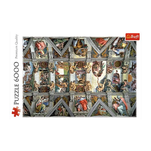 Puzzle 6000 elementów przedstawiające sklepienie Kaplicy Sykstyńskiej. Po ułożeniu powstanie obrazek o wymiarach 136x96 cm. Wysoką jakość, nasycenie kolorów i bezpieczeństwo układania zapewnia wykorzystanie materiałów ekologicznych.