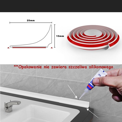 Klej: najważniejszym i niezbędnym krokiem jest wypełnienie dolnej krawędzi paska zatrzymującego wodę uszczelką, aby zapewnić długotrwałą i silną przyczepność (opakowanie nie zawiera szczeliwa silikonowego).