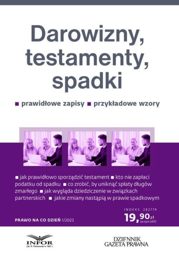 Praktyczna publikacja, która pomoże zaplanować wszystkie czynności związane z przekazaniem majątku m.in. na wypadek śmierci. Autorka bardzo przystępnie wyjaśnia, jak prawidłowo i zgodnie z prawem dokonać darowizny, zawrzeć umowę o dożywocie bądź sporządzić testament. Szczegółowo omawia też zasady dziedziczenia ustawowego, skutki przyjęcia spadku, a także zmiany, jakie są planowane w tym zakresie. Czytelnik dowie się z książki m.in.: ? kiedy testament ustny jest ważny, ? ile czasu ma spadkobierca na odrzucenie spadku, ? jak sporządzić wniosek o stwierdzenie nabycia spadku do sądu, ? czym jest zapis testamentowy, ? kto może żądać zachowku. Ponadto poradnik wyjaśnia: ? jakie są rodzaje testamentów, ? jak przebiega dział spadku, ? na jakich zasadach dziedziczą dzieci w rodzinie zastępczej, ? jakie dane można uzyskać w Rejestrze Spadkowym, ? gdzie znaleźć informacje o rachunkach bankowych zmarłego, ? jak odrzucić spadek, ? co dzieje się z małą firmą po śmierci właściciela, ? kto może dziedziczyć gospodarstwo rolne, ? czym jest umowa o dożywocie, ? jak prawidłowo zawrzeć umowę darowizny, ? czy darowizna wpływa na dziedziczenie. Poradnik zawiera także wzory umów, testamentów i wniosków w postepowaniu spadkowym. Objaśnia znaczenie najważniejszych postanowień umowy darowizny oraz umowy o dożycie, które często są stosowane, aby jeszcze za życia przekazać majątek wskazanym osobom. Autorka poświęca także uwagę opodatkowaniu otrzymanych spadków i darowizn. Wskazuje, kto może nie płacić podatku, a także jak obliczyć należny podatek i jaką deklarację należy przedłożyć do urzędu skarbowego. ATUTY PUBLIKACJI: Prosty język, praktyczne przykłady, wzory umów i wniosków, informacje o wysokości opłat sądowych i notarialnych sprawiają, że jest to najlepszy tego typu poradnik na polskim rynku.