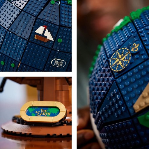 - Autentyczny ruch obrotowy — globus stworzony jest z dwóch rodzajów części LEGO: elementy LEGO Technic tworzą klasyczną, obracającą się oś, a klocki LEGO System nadają globusowi kulisty kształt.