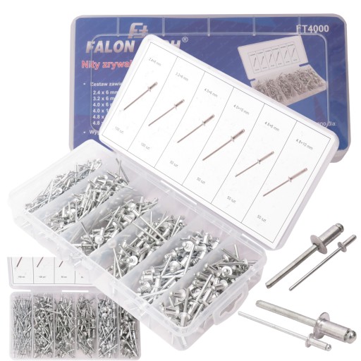 Uniwersalny zestaw nitów zrywalnych używany przy nitowaniu. Całość umieszczona w poręcznym pudełeczku z przegrodami podzielonymi na rozmiary. Każda przegroda ma wypisane rozmiary jakie w sobie zawiera.