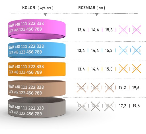 osoba, która je odnajdzie, będzie mogła natychmiast skontaktować się z Tobą dzięki wygrawerowanej na opasce informacji, co zapewni szybką łączność w sytuacji zagrożenia lub pozowoli zadbać o zdrowie Twojego dziecka.