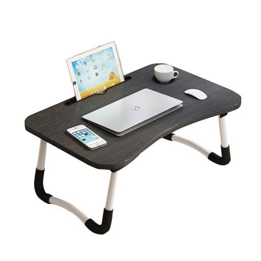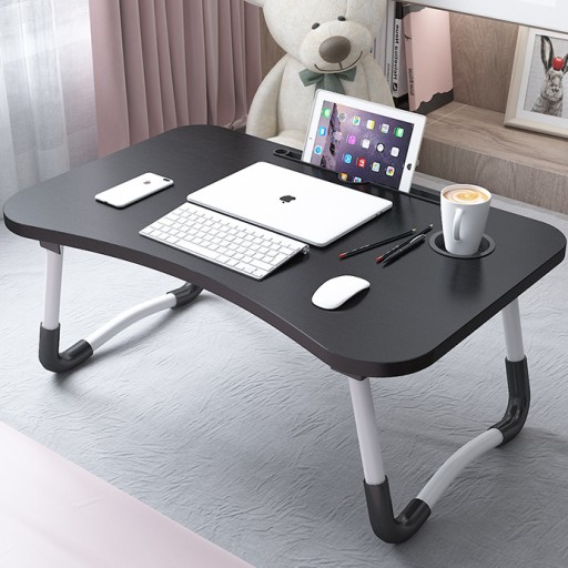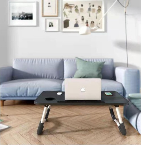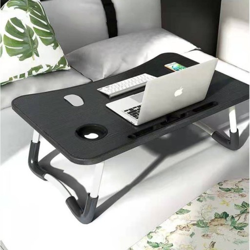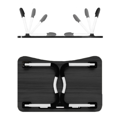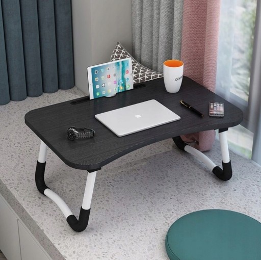 Kompaktowy stolik pod komputer lub tablet. Idealny do pracy i zabawy w domu lub podczas podróży. Umożliwia komfortowe użytkowanie laptopa czy innego urządzenia w praktycznie każdych warunkach. Po złożeniu zajmuje niewiele miejsca, można łatwo go schować np. pod łóżko i mieć go zawsze pod ręką. Wyposażony w profilowane zagłębienie na tablet lub telefon. Można też przeciągnąć ładowarkę i ładować te urządzenia jednocześnie z nich korzystając. Miękkie, antypoślizgowe zabezpieczenia nóżek zwiększa stabilność i zabezpiecza stolik.