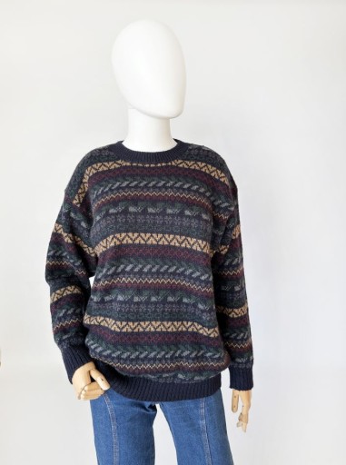 Ręcznie dziergany sweter vintage z Peru. Wykonany w całości z miękkiej i przytulnej wełny alpaki - baby alpaca. Klasyczny fason z długimi rękawami i zabudowanym okrągłym dekoltem. Na całości regularne pasy wzorów. Naszym zdaniem idealny jako unisex.